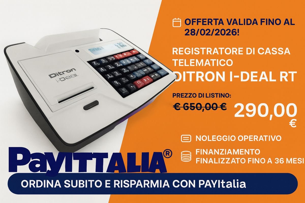 Offerta valida fino al 28/02/2026 salvo esaurimento scorte. Il prezzo promozionale di € 290,00 + IVA è riferito esclusivamente al Registratore di Cassa Telematico DITRON I-DEAL RT e non comprende trasporto, installazione, messa in opera e formazione, che possono essere richiesti come servizi aggiuntivi. La manutenzione ordinaria è inclusa per il primo anno dalla data di attivazione del dispositivo. Il prodotto è coperto da garanzia di 12 mesi secondo normativa vigente. I tempi medi di consegna sono stimati in 5/7 giorni lavorativi, salvo periodi festivi, eventi straordinari, manifestazioni, scioperi o circostanze indipendenti dalla nostra volontà. Le condizioni del noleggio operativo e del finanziamento finalizzato sono soggette ad approvazione della società valutatrice ed erogatore. Messaggio con finalità promozionale. Immagini a scopo illustrativo. PAYItalia si riserva il diritto di modificare prezzi, condizioni, specifiche tecniche e disponibilità in qualsiasi momento senza preavviso.